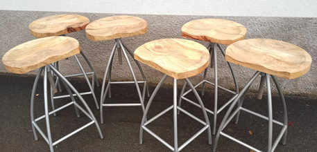Lot de 6 tabourets réglables en bois avec pieds en métal.